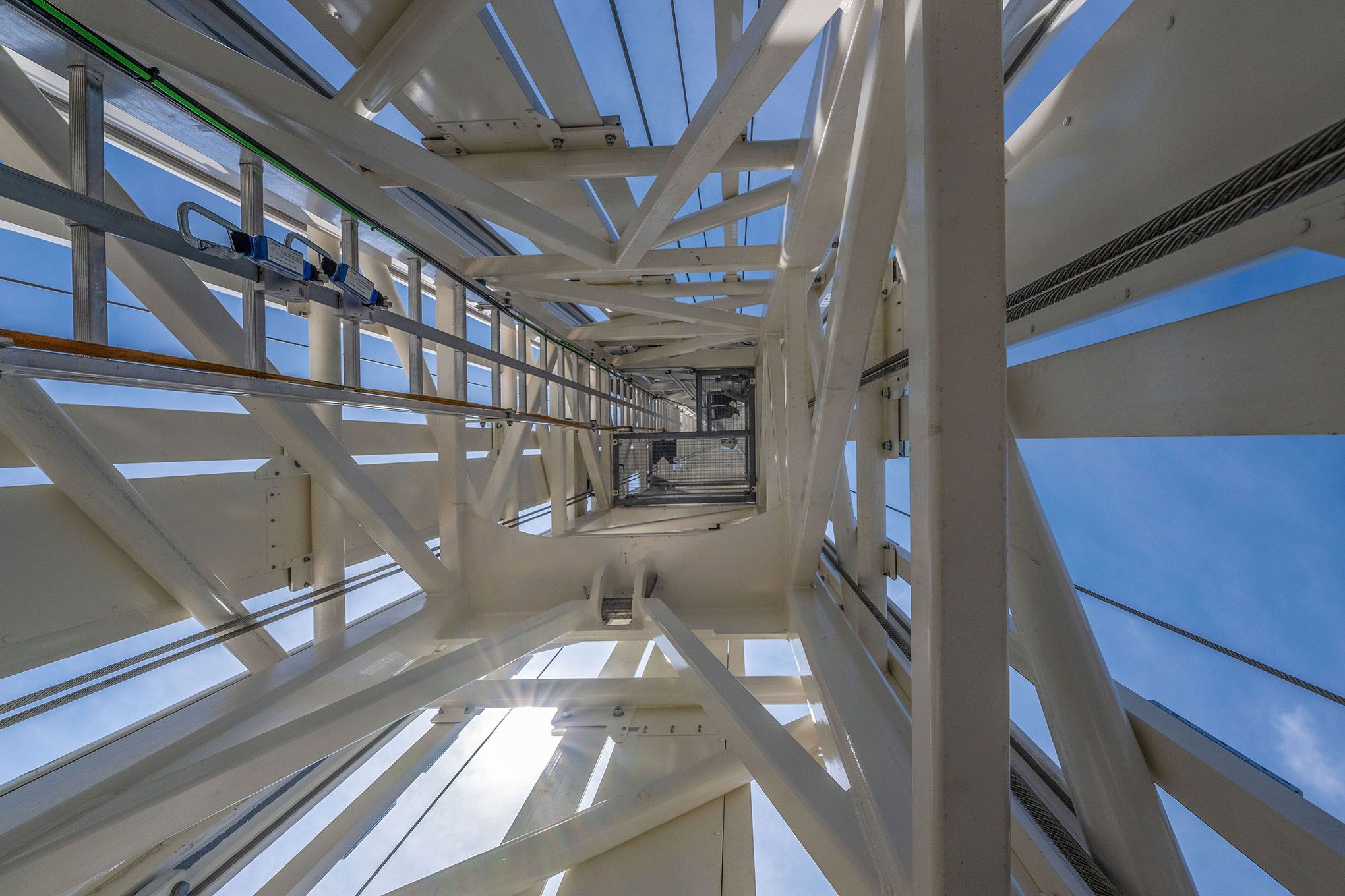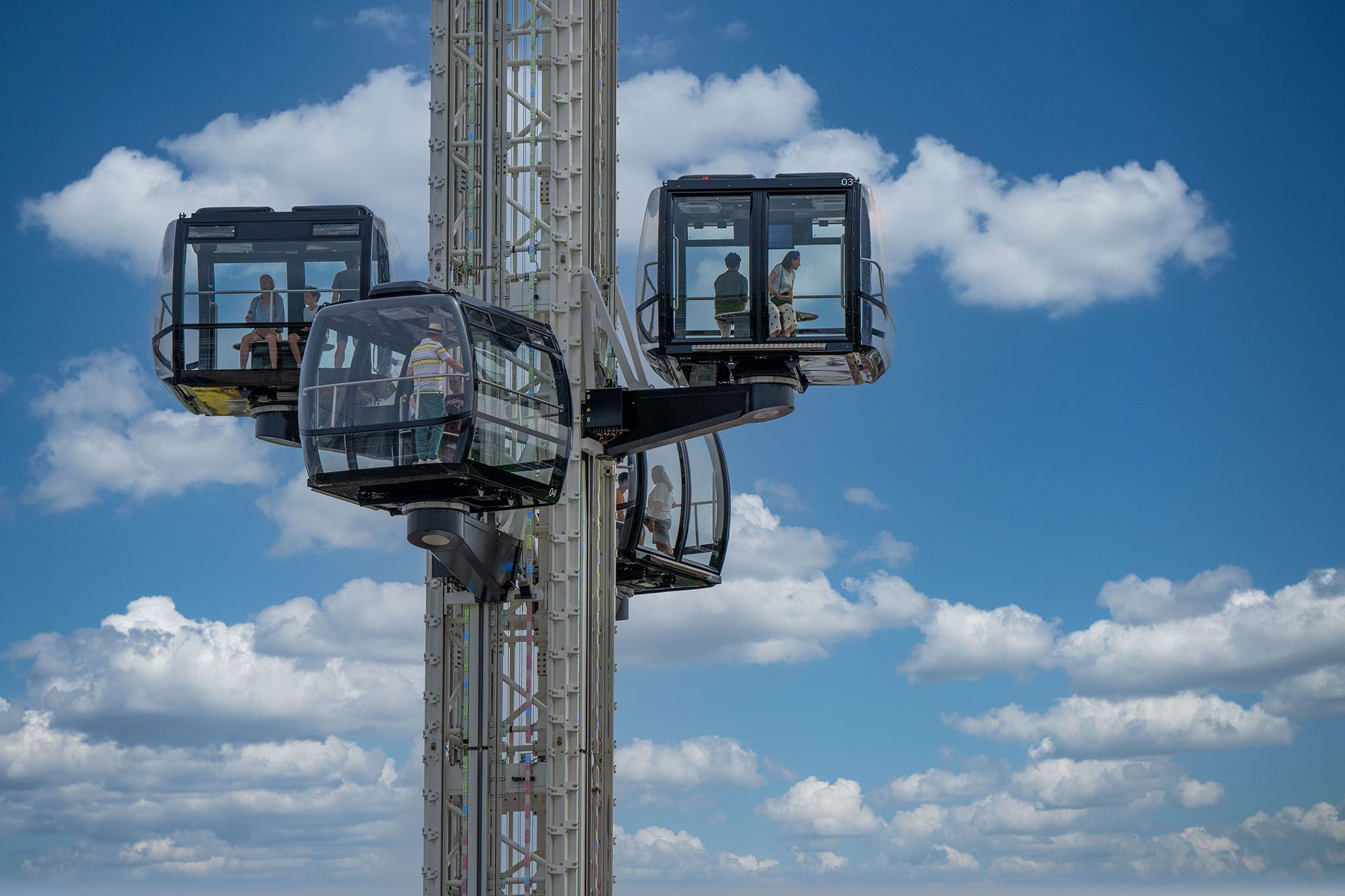 Dank des innovativen Paralift-Systems gleiten die vier vollverglasten Kabinen nahezu lautlos auf 71 Meter Höhe – sanft, sicher und völlig kranunabhängig. Während der gesamten Fahrt rotieren die Kabinen um die eigene Achse und ermöglichen einen echten 360°-Panoramablick – ohne dass sich die Gäste vom Fleck bewegen müssen.